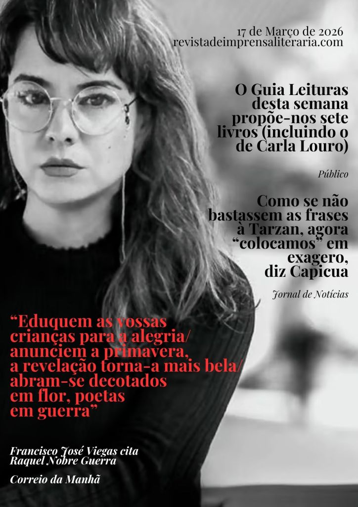 Vale a pena começar o dia a citar Francisco José Viegas a citar Raquel Nobre Guerra no CORREIO DA MANHÃ: “Eduquem as vossas crianças para a alegria / anunciem a primavera, a revelação torna-a mais bela / abram-se decotados em flor, poetas em guerra.”. Está em Postes de Luz para Cães Vadios (Edições tinta-da-china).